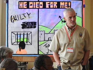 Frank used the sketch board technique and scripture concerning Barabas, as he leads a conference breakout session, slowly revealing the Gospel.